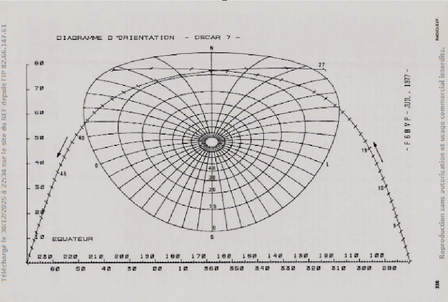 Un article de W5PAG, paru dans le bulletin de l’AMSAT NA de décembre 1973, présentait la description d’un nomogramme qui offre une solution très simple pour déterminer rapidement l’orientation et l’élévation d’un satellite par rapport à une station. Les seules données à connaître sont les prévisions de passage publiées mensuellement dans Radio-REF : longitude de passage à l’équateur et heure de croisement, pour chaque orbite ascendante. J’ai demandé à mon beau-frère Henri Orland REF 28.286 normalien agrégé de physique de me calculer les formules utiles pour programmer en BASIC une table traçante HP afin de dessiner un nomogramme. Ce fut l’occasion d’apprendre à programmer en BASIC et d’écrire mon premier programme. C’est ainsi que nous avons publié dans la revue Radio-REF en avril 1978 un article avec deux nomogrammes pour aider à orienter les antennes de poursuite des satellites OSCAR 7, OSCAR 8 et RS19.