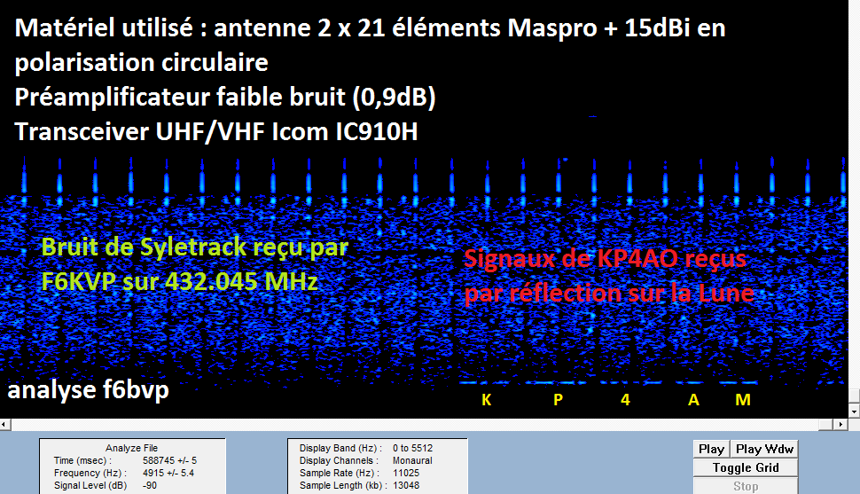 Le lendemain Samedi 18 avril KP4AO avait mis en route un PA de 350 W. La réception des signaux de KP4AO en écho via la Lune a été possible.