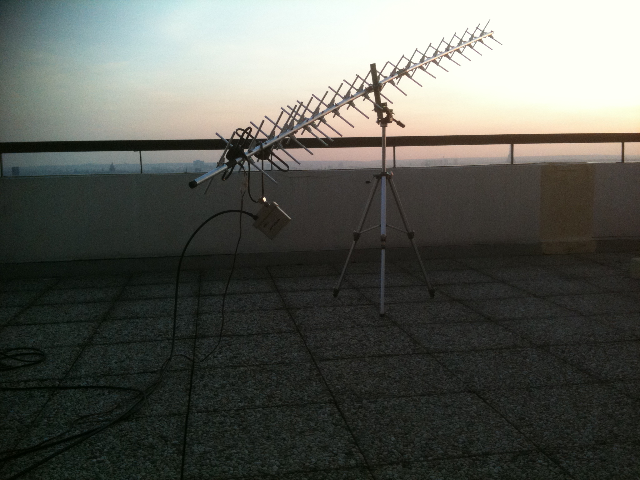 Le matériel était « élémentaire » : antenne MASPRO deux fois 21 éléments croisés en polarisation circulaire commutable droite-gauche (gain +13dBi) montée sur un trépied, préamplificateur 432 MHz SSB Electronics (facteur de bruit 0,9 dB) et transceiver ICOM 910H bibande UHF-VHF (75 W en émission).