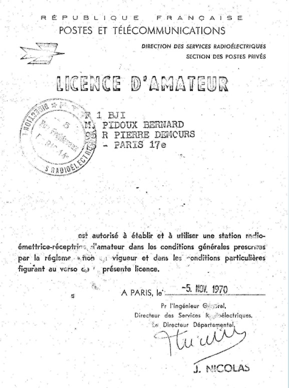 Mon premier indicatif radioamateur a été F1BJI en 1970. A cette époque l’inspecteur se déplaçait au domicile du candidat ! J’ai ensuite étudié la lecture au son du code morse, passé l’examen télégraphie avec le même inspecteur F2XS pour compléter ma licence radioamateur. J’ai obtenu l’indicatif F6BVP et suis devenu un OM complet (Old Man comme s’appellent entre eux les radioamateurs, les opératrices étant des YL pour Young Lady et les enfants des QRP !).