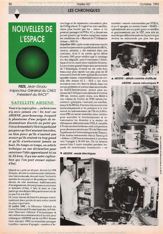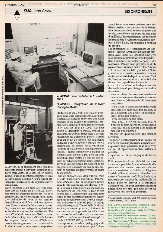 - Projet du RACE du remarquable mini satellite français de 165 Kg, ARSENE (OSCAR 23), lancé le 12 mai 1993.