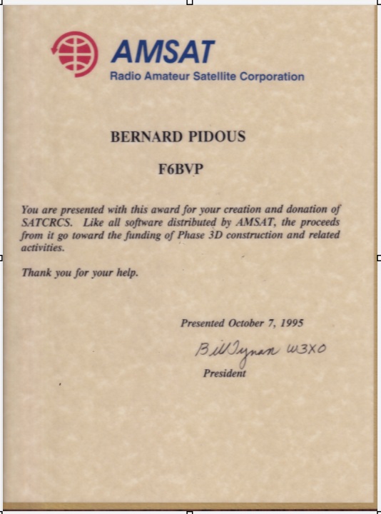 En Décembre 1991, F6BVP a été la première station française métropolitaine à trafiquer en paquet par satellite à 9600 bauds avec le protocole PACSAT. Les microsats étaient UOSAT-3 et UOSAT-5. J’utilisais les programmes PB et PG de Harold Price NK6K et Jeff Ward G0/K8KA, un modem 9600 G3RUH sur un TNC-2 (EPROM TAPR 1.1.7b) et des appareils ICOM IC-490 (UHF) / IC-290 (VHF) modifiés pour le 9600 bauds (prises directes sur la diode varicap et filtre FI plus large).